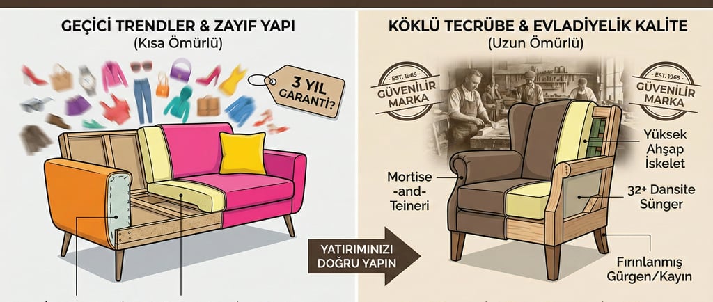 Mobilya aldığınızda, aslında bir "hizmet" satın alırsınız. Yeni kurulan popüler bir marka, 3 yıl sonra piyasadan silinebilir. Ancak sektörde yıllarını devirmiş bir marka, sattığı ürünün arkasında durur. 5 yıl sonra bir yedek parçaya veya kumaş değişimine ihtiyaç duyduğunuzda, karşınızda hala bir muhatap bulabilmek paha biçilemezdir.